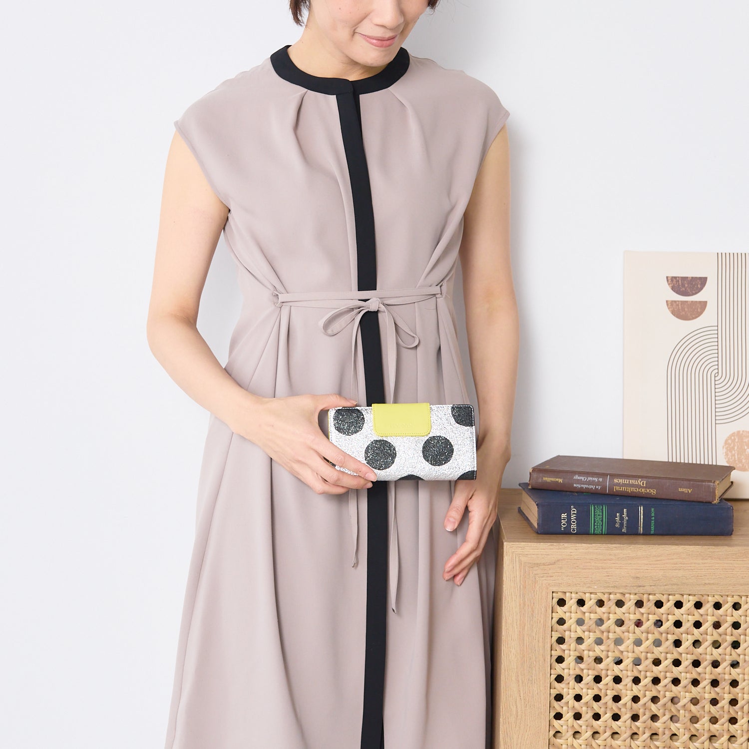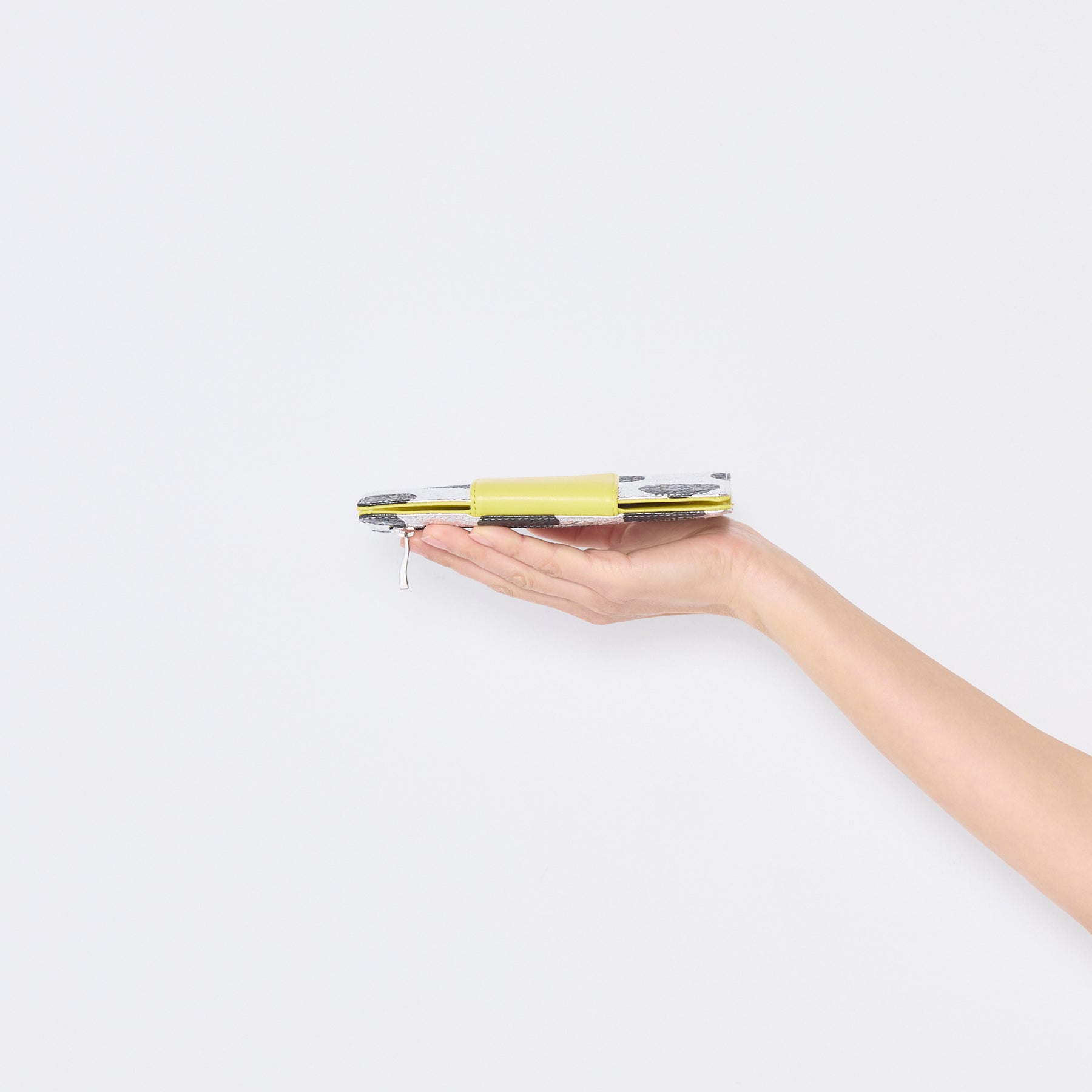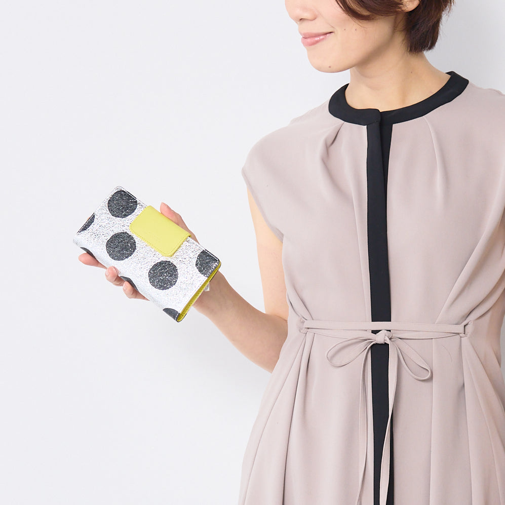 シルバー箔を加工した豚革にドットをプリントし、付属の革には差し色のイエローを組み合わせました。